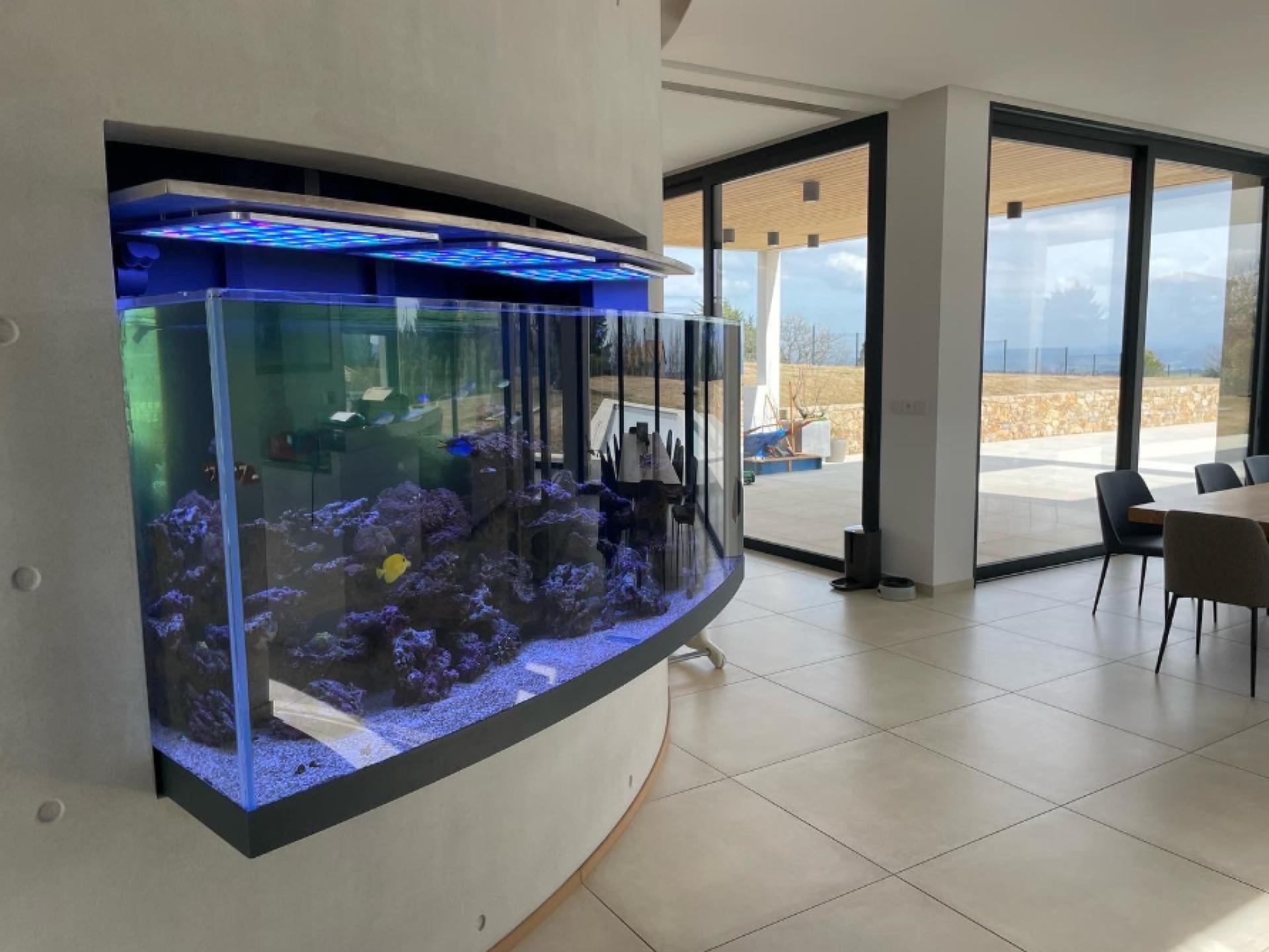 À Peaugres, un aquarium sur mesure en verre bombé a été réalisé pour s’intégrer parfaitement dans une cloison courbe d’une pièce à vivre. Ce projet illustre la précision et la technicité nécessaires à ce type d’ouvrage.