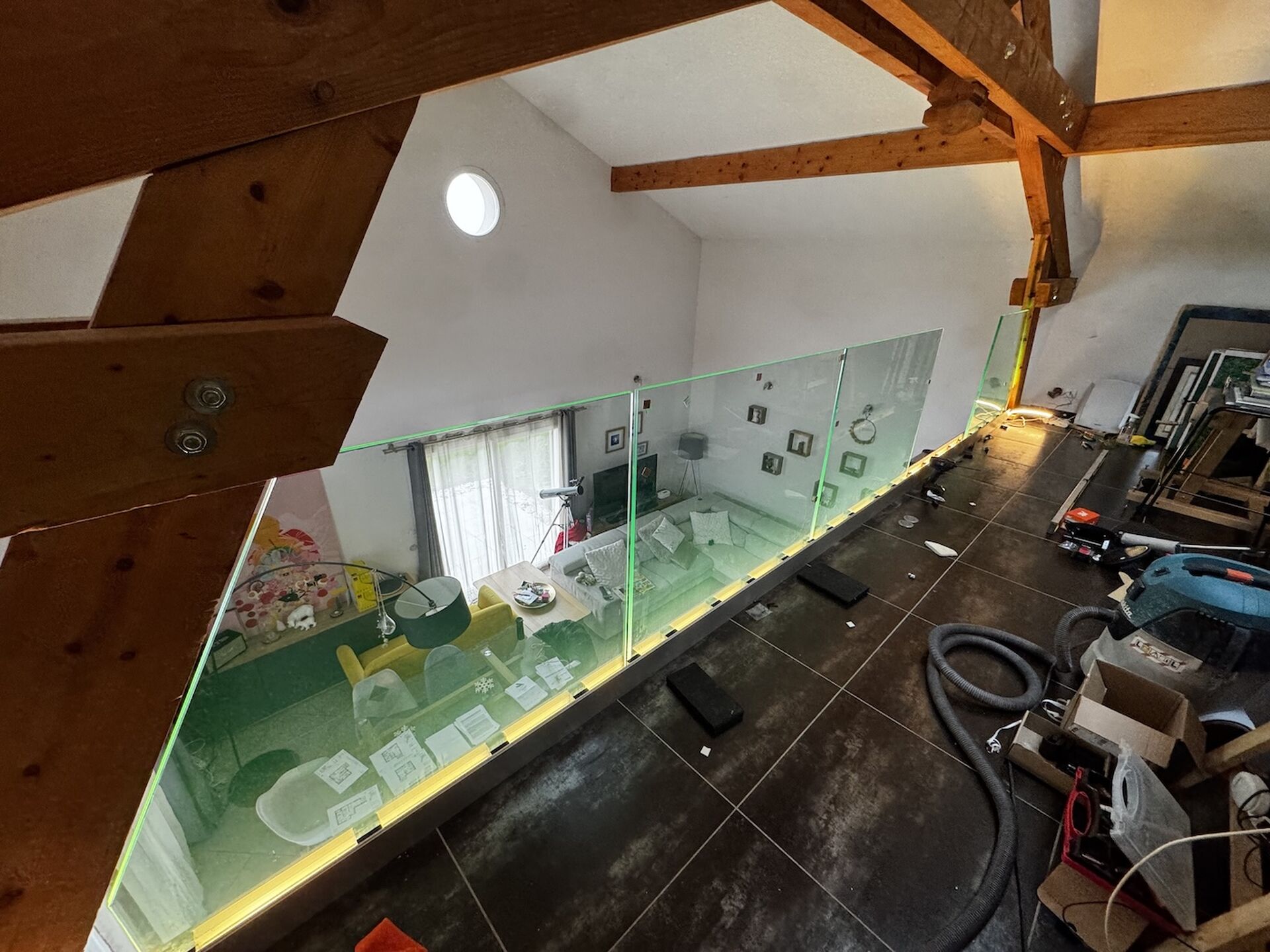 L'installation d'un garde-corps d'escalier à ANNECY allie sécurité structurelle et design minimaliste. Ce projet utilise un verre feuilleté trempé haute résistance, fixé par un rail au sol SADEV. L'ensemble intègre des capots de finition en nez de dalle et un éclairage LED.