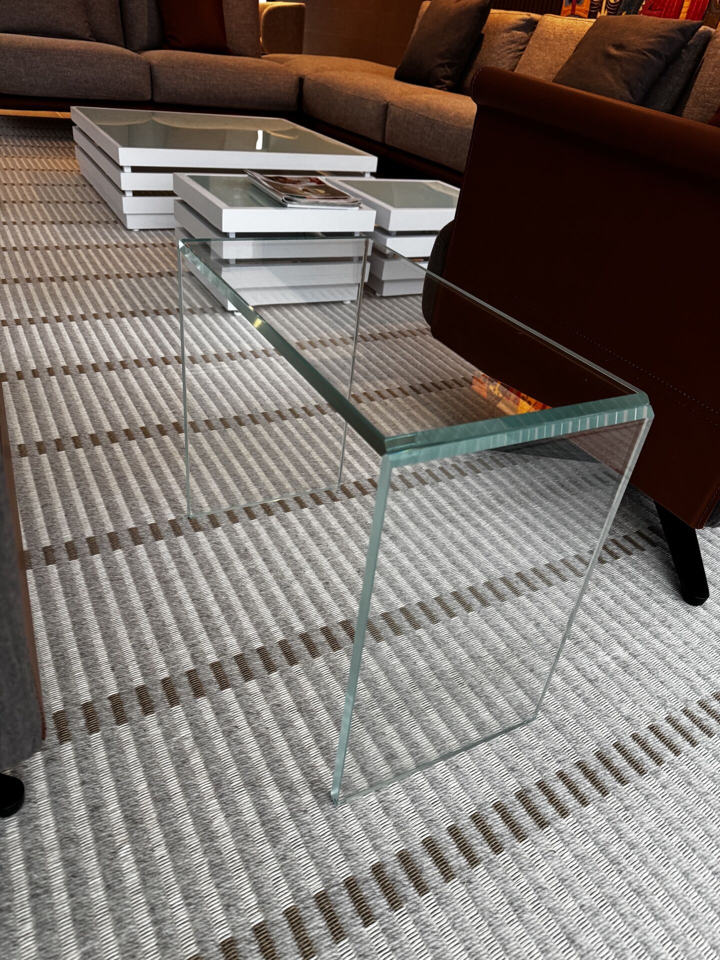 La réalisation de ce mobilier en verre repose sur une préparation rigoureuse des surfaces. Chaque pièce utilise un verre extra-clair de 15 mm, choisi pour sa neutralité chromatique et l'absence de reflets verdâtres sur les tranches. Le façonnage inclut des bords polis et un chanfrein sur mesure, offrant une finition lisse et sécurisée tout en captant la lumière.