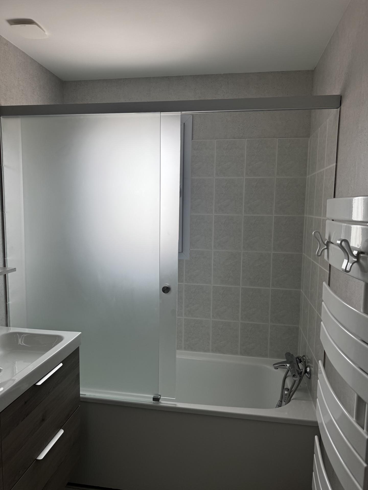 Le projet présenté repose sur un verre trempé de 8 mm d’épaisseur, choisi pour sa résistance aux chocs et sa durabilité. Le dépoli acide mat apporte un aspect esthétique discret, favorisant l’intimité sans compromettre la luminosité. L’installation s’appuie sur un rail coulissant de mur à mur, assurant un guidage stable et une manipulation fluide. Le système, étudié pour un silence de fonctionnement optimal, permet une fermeture complète et hermétique de la baignoire.