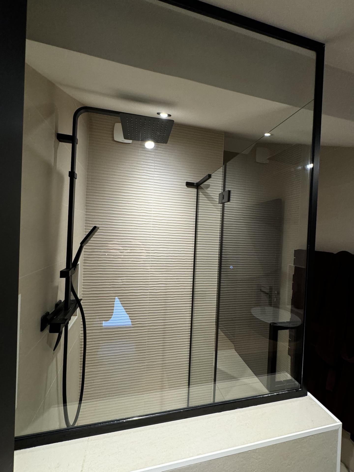 Le projet repose sur un verre trempé de 8 mm d’épaisseur avec bords polis, garantissant une excellente sécurité contre les chocs. La quincaillerie noire souligne les lignes de l’ensemble et crée un contraste élégant avec les carreaux clairs. L’installation inclut une cloison fixée sur un muret, une porte montée sur charnières et un raidisseur en angle noir assurant la stabilité. Le traitement anticalcaire appliqué sur le verre contribue à limiter l’entretien et à préserver la transparence dans le temps.