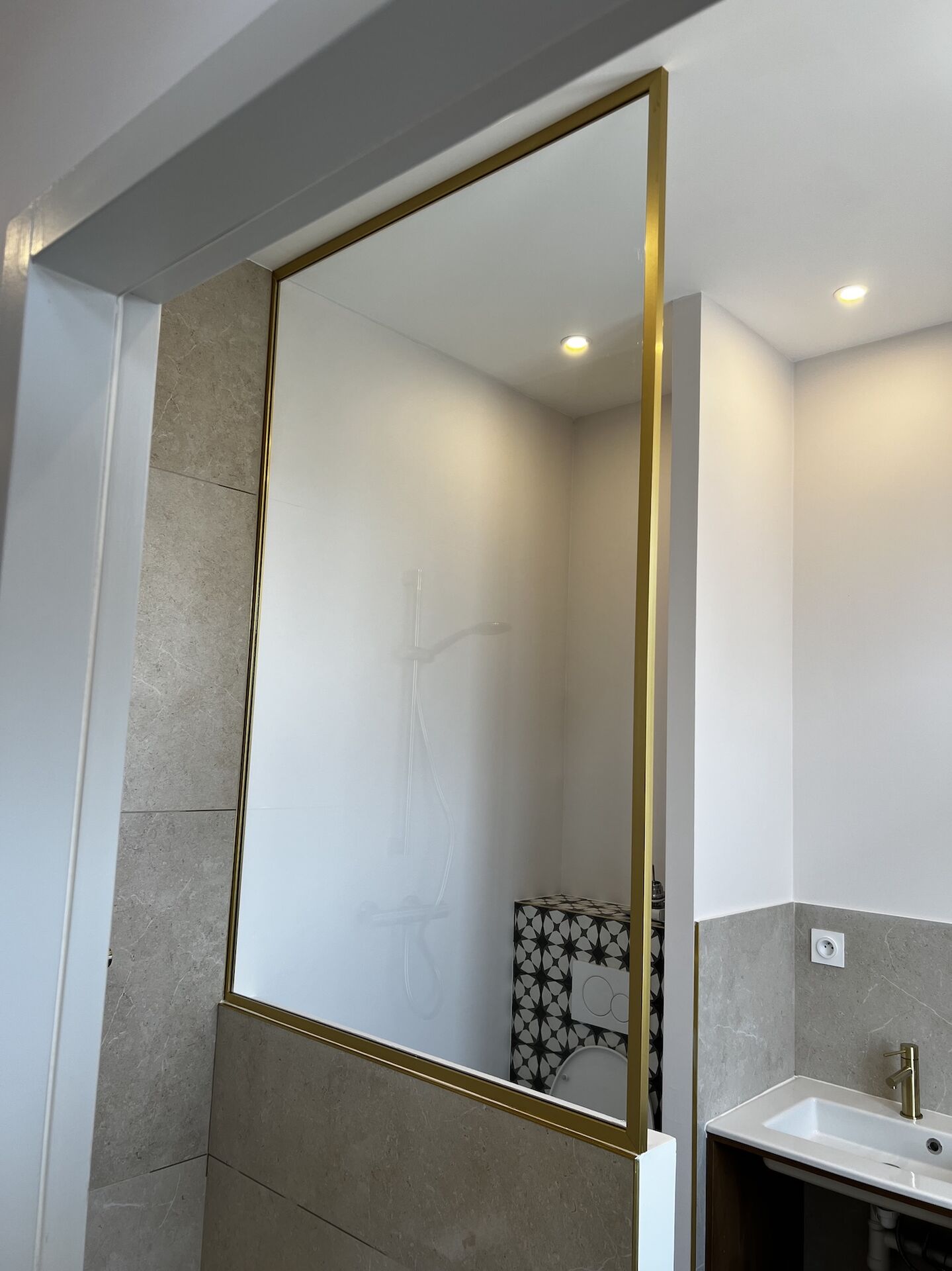 La réussite de cette réalisation à Lyon repose sur un ajustement parfait des angles entre le vitrage et le muret de séparation. La structure alu sur mesure a été choisie avec une finition dorée spécifique, permettant une harmonie visuelle totale en étant parfaitement coordonnée avec la quincaillerie de la robinetterie existante.