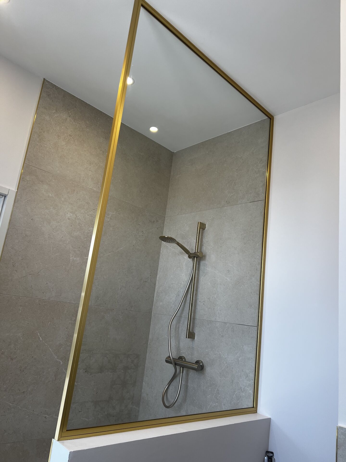 L'installation d'une paroi de douche sur muret à LYON optimise votre espace bain avec élégance et robustesse. Ce projet sur mesure intègre un verre de sécurité 8 mm traité anticalcaire, maintenu par une structure alu finition dorée pour un design moderne et durable.