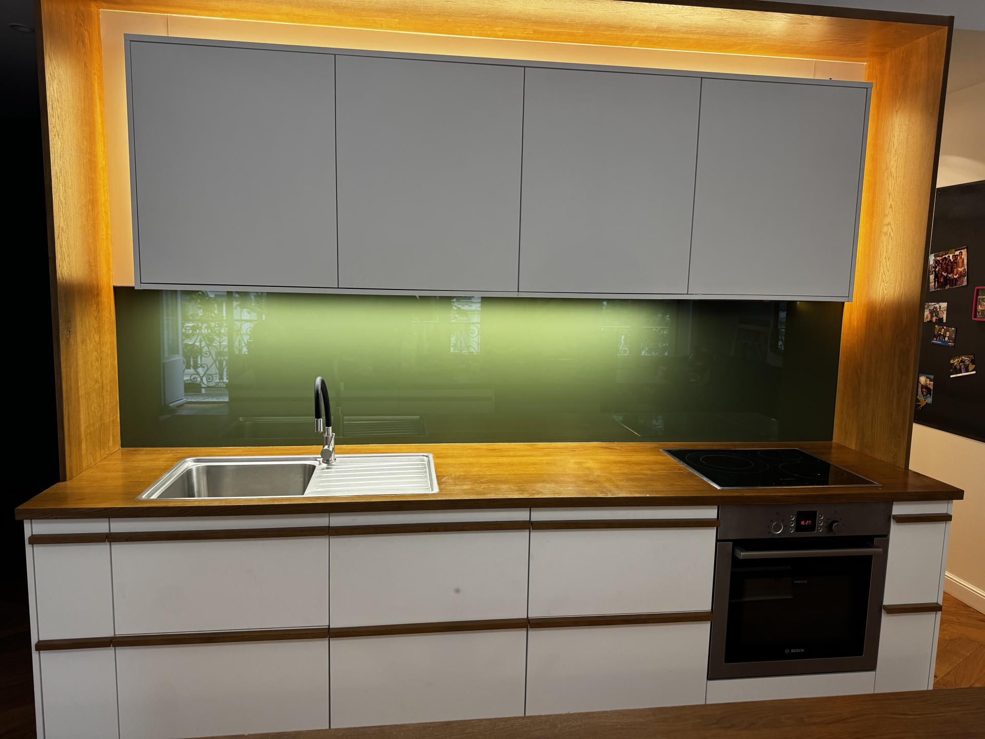 Dans ce projet, des crédences en verre trempé sécurit d’épaisseur 6 mm ont été réalisées sur de grandes dimensions. Les bords polis et l’ajustement précis sur quatre côtés garantissent une intégration nette et élégante. Le verre laqué a été conçu sur mesure à partir d’un nuancier, permettant une harmonie totale avec le mobilier et les finitions bois. Sa résistance à la chaleur et aux chocs en fait une solution idéale derrière plaques de cuisson et éviers.
