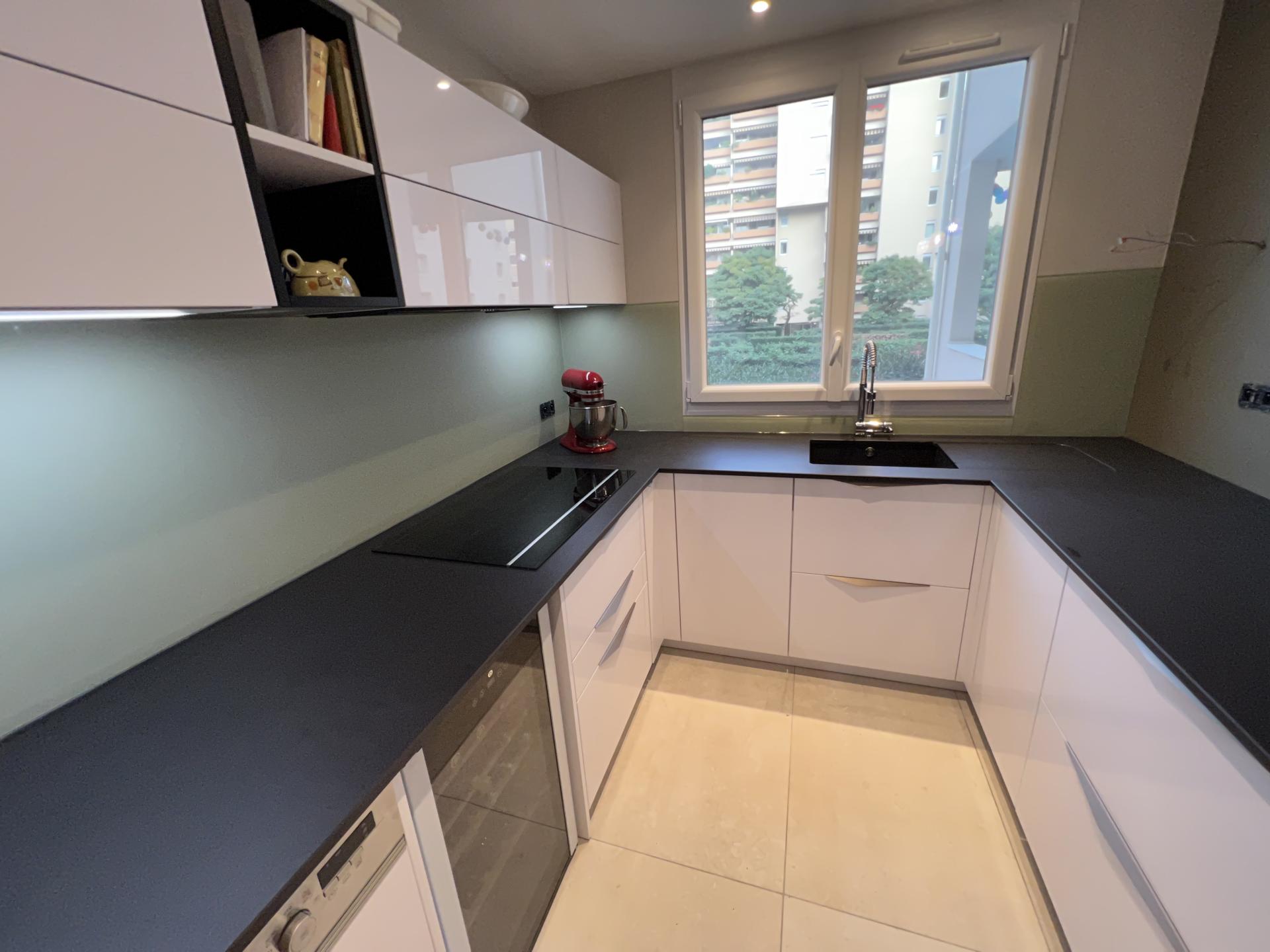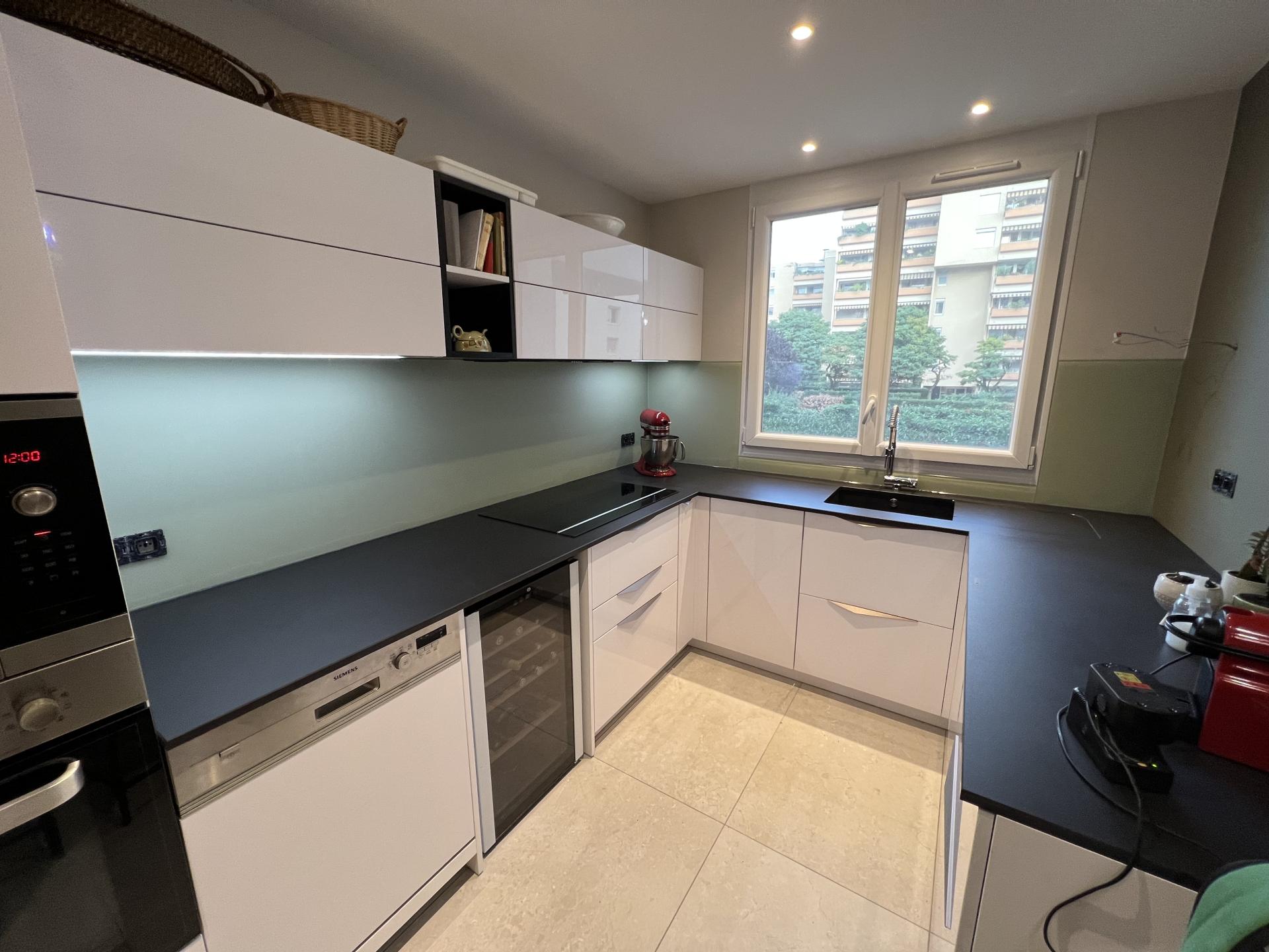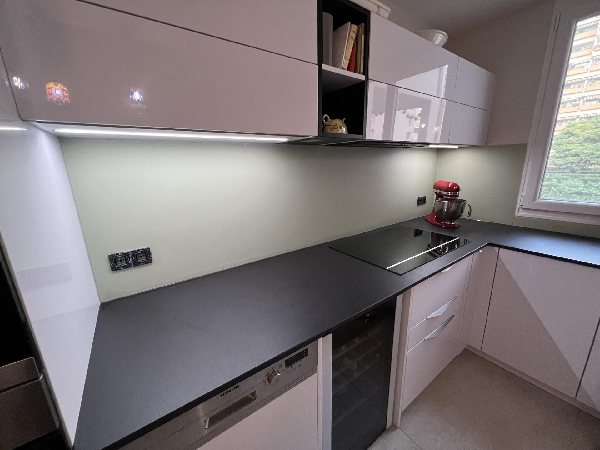 Le verre utilisé présente un laquage mat, offrant un rendu contemporain tout en limitant les reflets et traces de doigts. Chaque panneau a été découpé sur mesure avec des bords polis et un ajustement précis sur les quatre côtés. L’intégration des prises électriques a été anticipée dès la fabrication, garantissant une continuité visuelle sans perte de confort. Le contournement de la fenêtre illustre le niveau de précision exigé, permettant un alignement parfait avec le plan de travail et les murs.